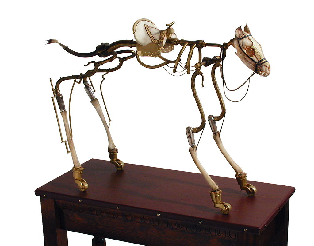 Her creations give a second lease of life to those animal bones. Her work is very precise and delicate. The shapes and colours have kind of a steampunk touch and we can easily imagine them walking and moving.