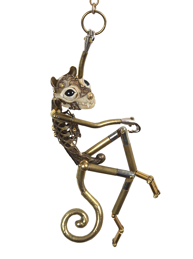 The little creatures that she creates consist of bones, which can be real or fake ones, but also of a lot of other parts that she found in flea markets, in hardware suppliers and even online. It can be bass parts, steel parts, velvet, hardware, bead, chain, etc.