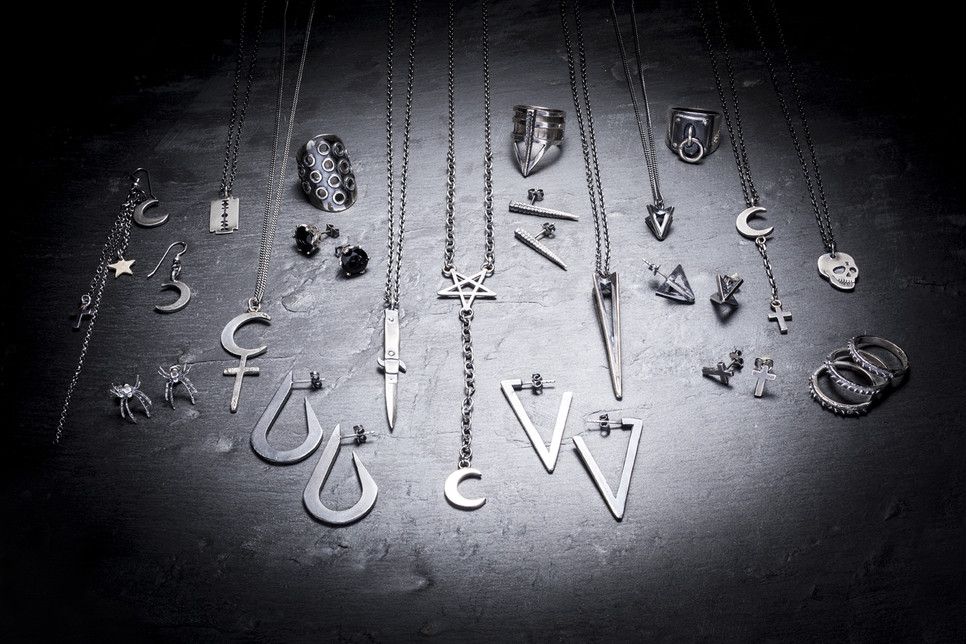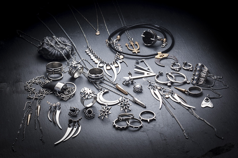 Each piece is handmade. She uses materials such as leather, silver sheet and wire. Then she transforms them into rings, earrings, studs, necklaces or bracelets to make a collection or just a unique piece. Most of the pieces that she makes have an oxidized finish and you will also find some recurring shapes in her work such as chains, pikes, skulls or crosses.